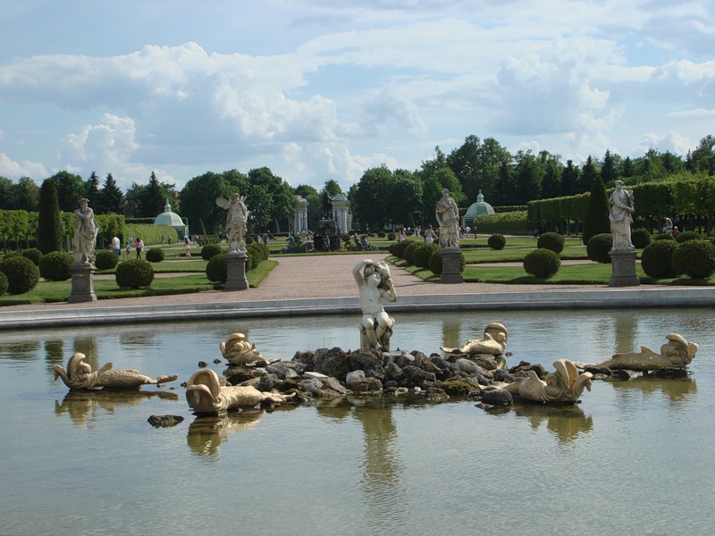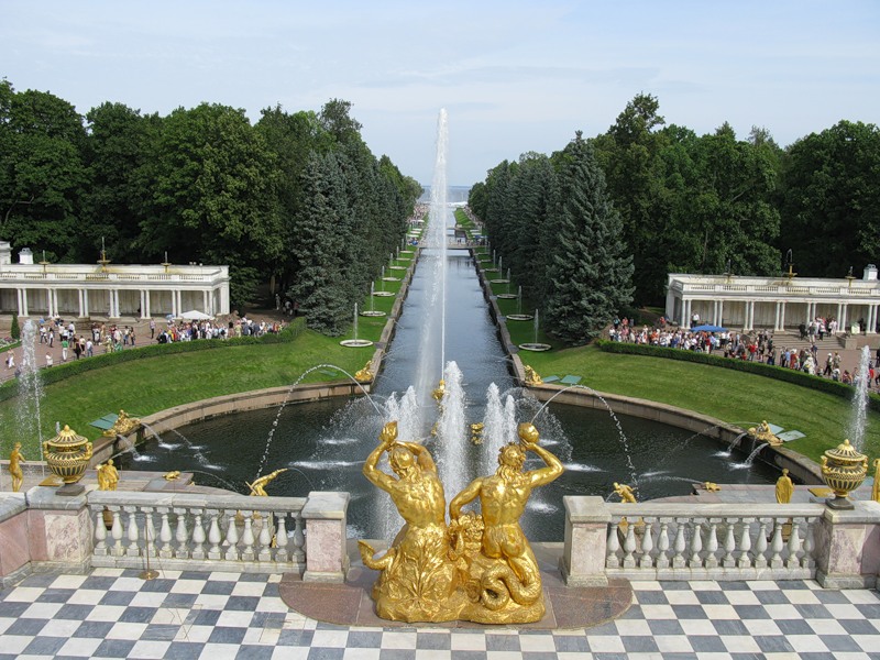 Территория Нижнего парка Петергофа в Санкт-Петербурге начинается от северного фасада Большого дворца, высившегося на 16 метров на природном уступе до береговой линии Финского залива.